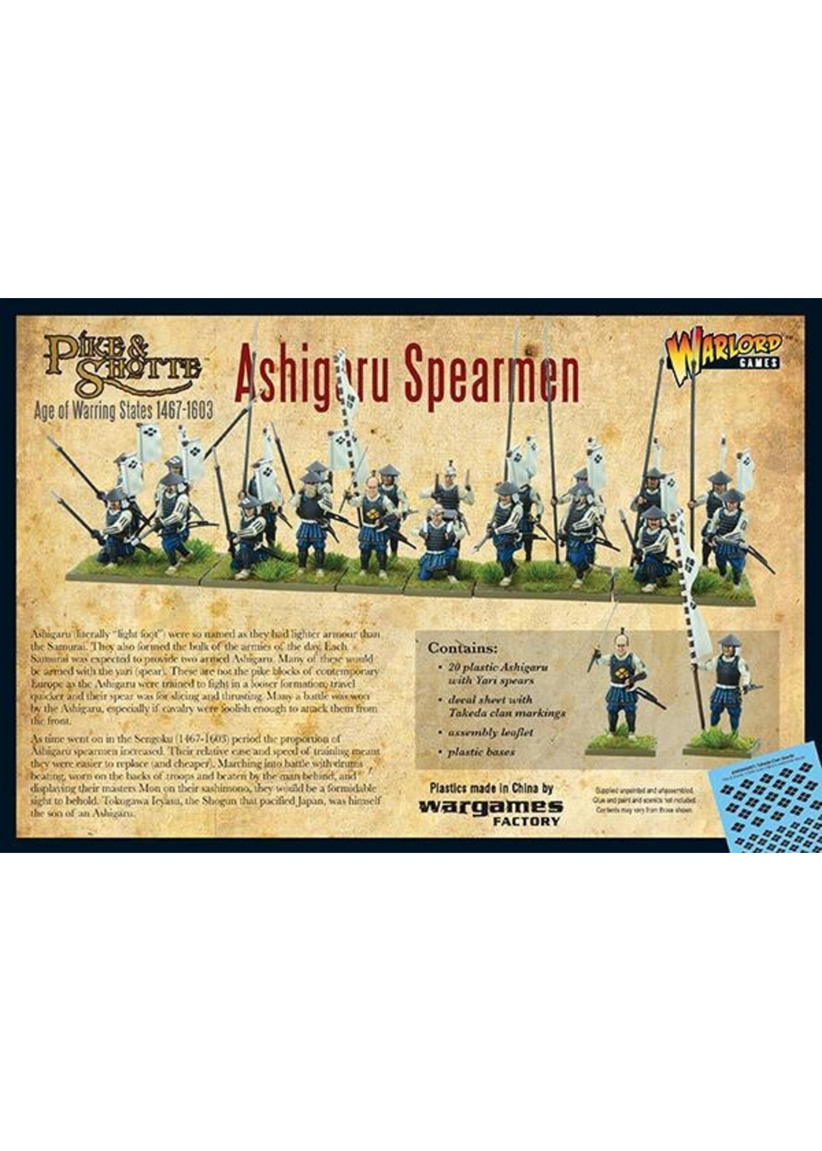 These are not the pike blocks of contemporary Europe as the Ashigaru were trained to fight in a looser formation, travel quicker and their spear was for slicing and thrusting. Many a battle was won by the Ashigaru, especially if cavalry were foolish enough to attack them from the front.